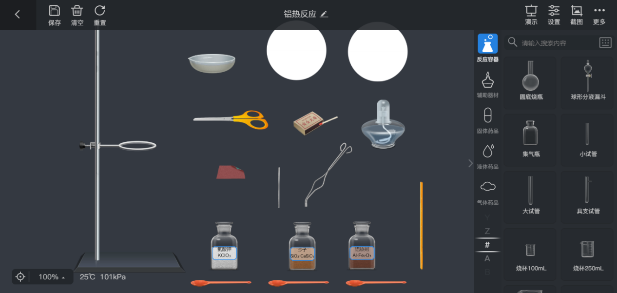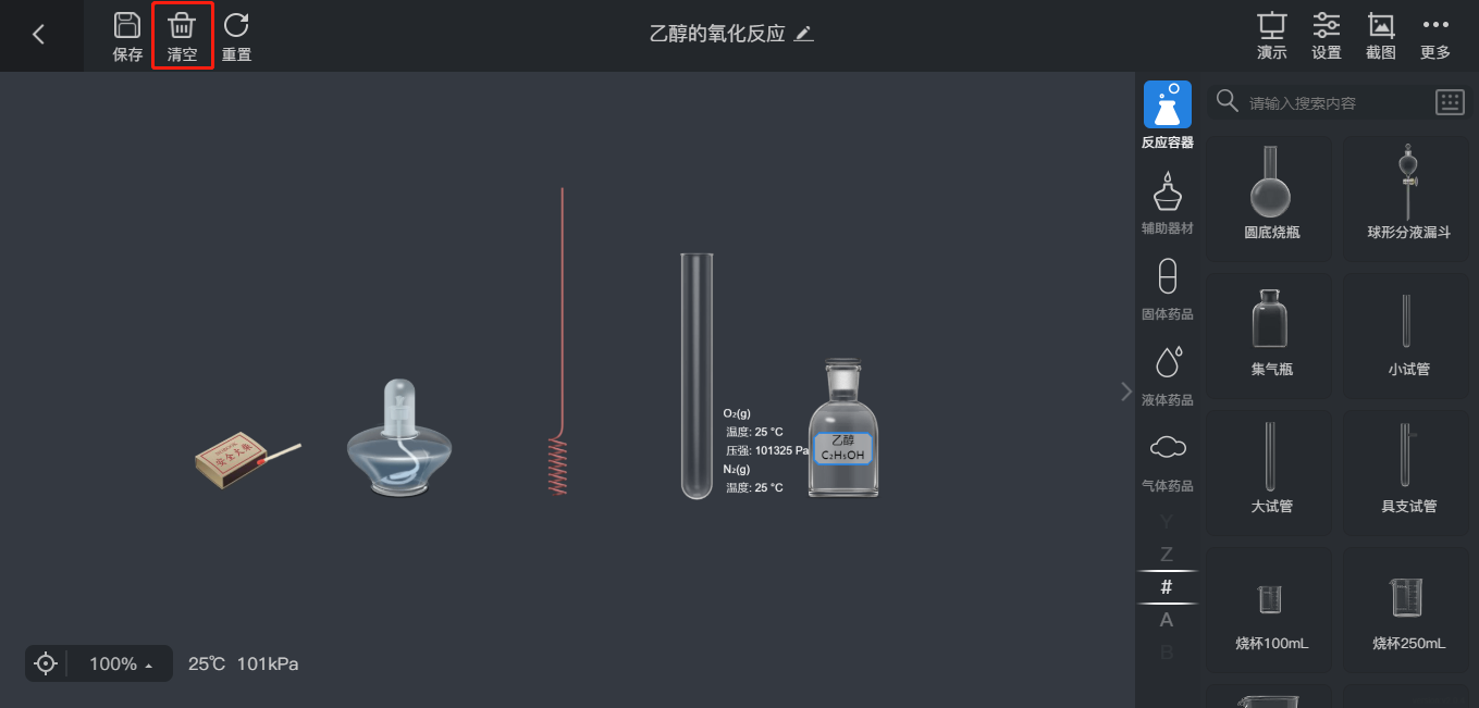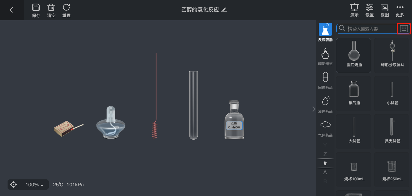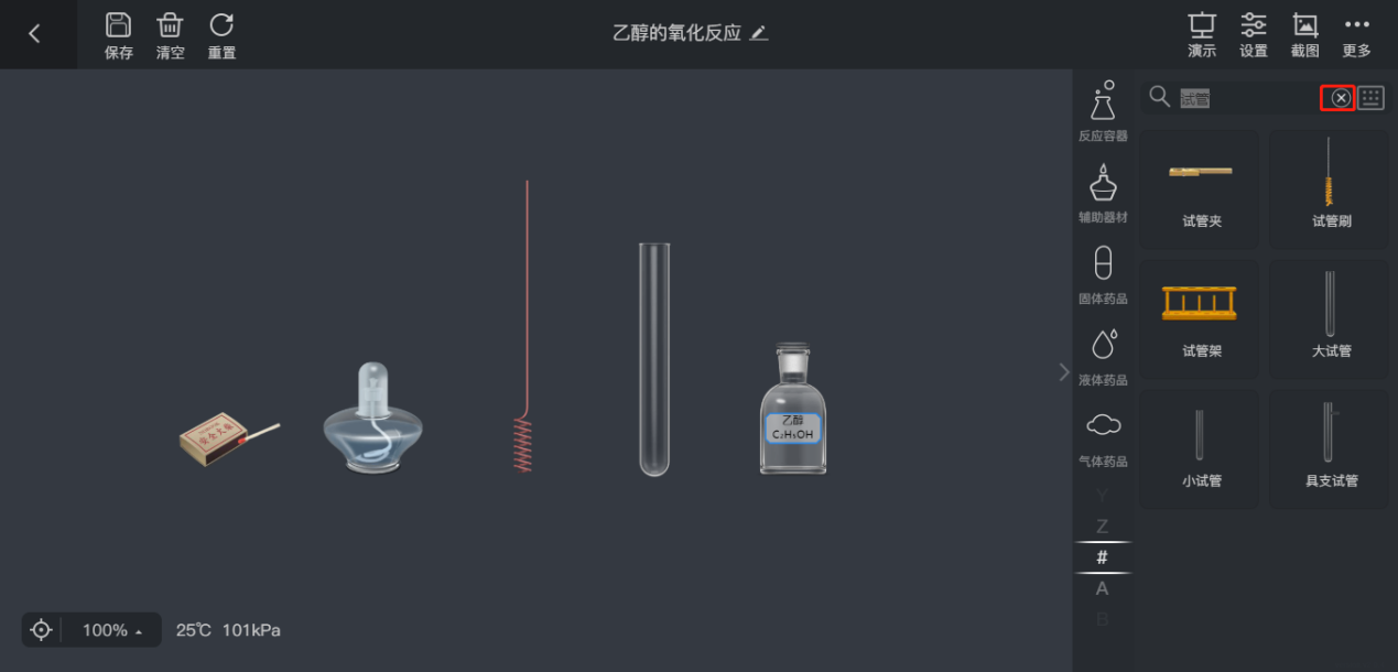 【器材库】:器材库中有关于本板块的全部实验器材和药品,可点击或拖拽至画布中;