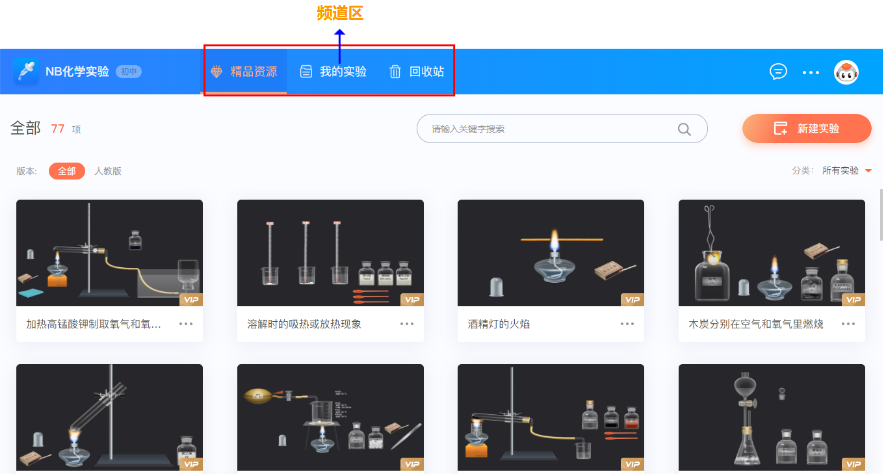 【精品资源内容区】是NB化学实验当前【精品资源】文件控制台中实验列表展示的区域,所有实验或者是相应版块的实验会在相应选择下进行展示。